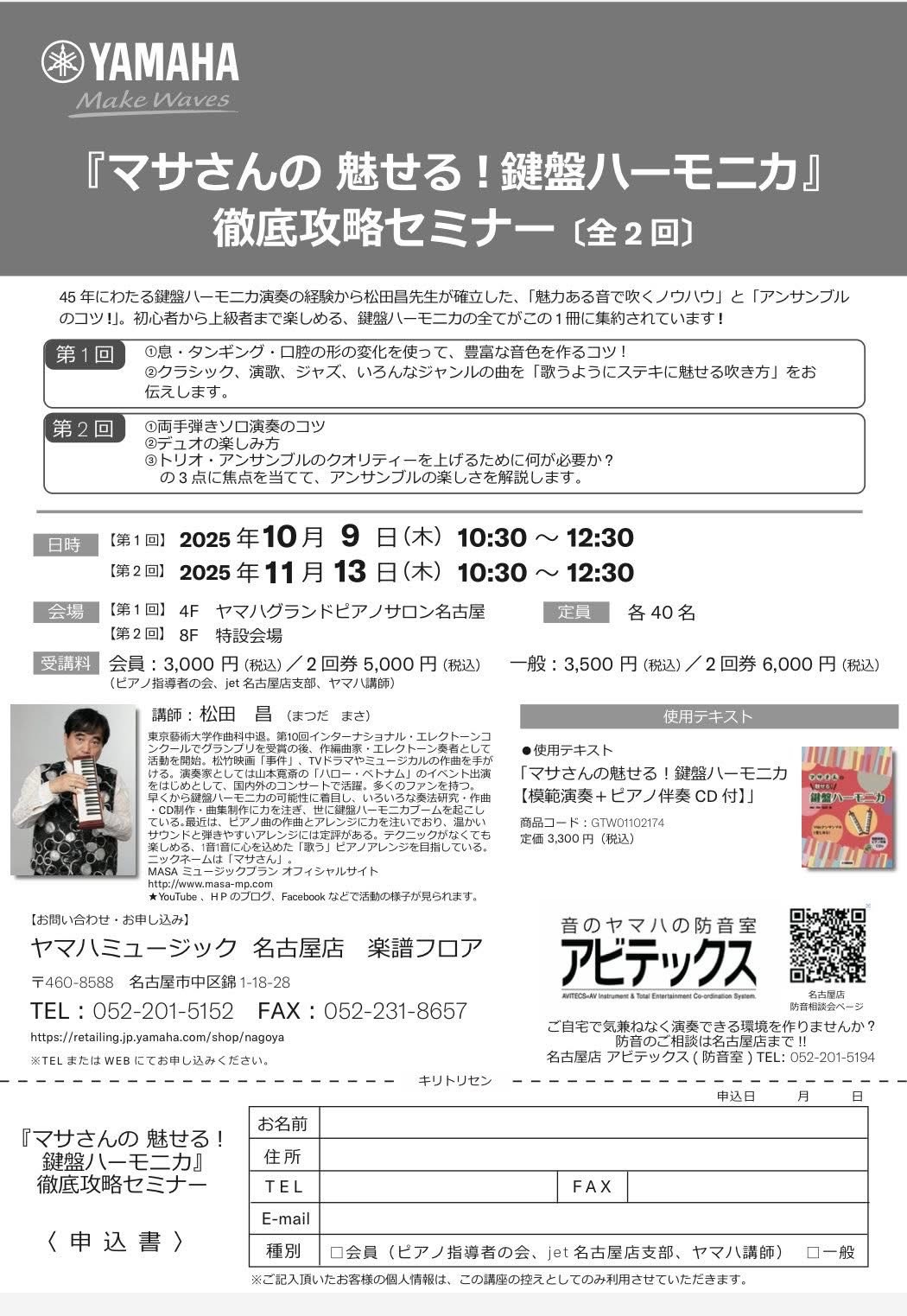 - 受講料/会員(ピアノ指導者の会、jet名古屋店支部、ヤマハ講師):3,000円/2回通し5,000円