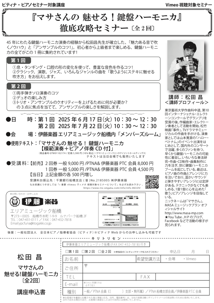 - 受講料/【前売】2回券:一般9,000円 PTNA&伊藤楽器PTC会員8,000円