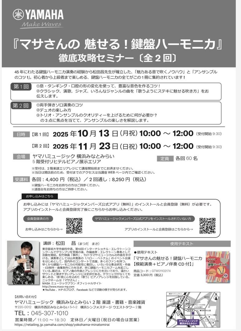 - 会場/ヤマハミュージック横浜みなとみらい 5階受付リヒテルピアノ展示エリア